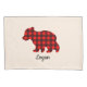 This pillow case features a bear cub silhouette filled in with a red and black check buffalo plaid pattern, and is set against a cream background. The pillow case can be personalized with a name or message of your choosing.