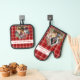 Black and red plaid pattern on these one of a kind oven mitts and pot holders