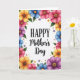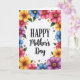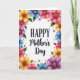This greeting card features a bright digital illustration on a white background with the words “HAPPY Mother’s Day” centered as the main focus. “HAPPY” appears in black, all caps, with a classic serif look, while “Mother’s Day” is written beneath it in a smooth, flowing black lettering style that feels gentle and affectionate ❤️. A border of stylized flowers wraps around the edges like a loose wreath, with petals in sunny yellow, soft blue, deep purple, and rosy pink, suggesting the kind of caring attention shared between close family or friends. Green leaves weave between the blossoms, and small extra flowers are sprinkled in the open spaces to make the frame feel full and lively 🌼. The text sits neatly in the open center, giving the floral border room to curve and ripple around it without crowding the message. Petals show soft shading and subtle gradients, while the flower centers have fine speckled detail that resembles pollen. Around the perimeter, the flowers and leaves form an undulating ring with scattered mini blossoms filling the corners.