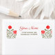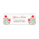 A custom return address business or baking label with etched and block letters and baroque art of daisies and curling leaves in red and golds, restored from an antique manuscript.
