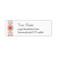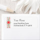 A custom return address label with script and standard letters and a vintage printers mark with a decorated shield and a floral design of daisies and curling leaves in red and golds, restored from an antique manuscript