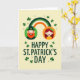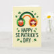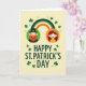 This card features a St. Patrick’s Day scene with a wide rainbow arcing across the top, striped in green, white, and orange like the Irish flag 🌈. Beneath the rainbow sit two round portrait frames: a friendly red‑bearded man in a green hat and a red‑haired woman wearing a green bow, their faces turned slightly toward each other with matching, gentle smiles 💚. The background is a creamy pale yellow, dotted with dark green shamrocks and small starburst sparkles that float around the characters. The couple’s rosy cheeks and bright hair tones add warmth against the greens, giving the image a cozy, close-knit feel. Along the bottom, the message “HAPPY ST. PATRICK’S DAY” is set in large dark green letters, centered and easy to read. The text sits just below the portraits, with shamrocks sprinkled nearby to tie the lettering into the rest of the layout ☘️. Small clover shapes and tiny sparkles continue to scatter across the open space, especially around the rainbow and near the lower corners.