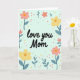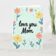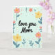 This card features a soft mint green background with the words “love you Mom” centered in a flowing black typeface, giving the message a close, affectionate feel ❤️. The text sits slightly above the middle, leaving breathing room for the flowers to gather around it like a gentle hug. Peach and sunlit yellow blossoms with warm orange-yellow centers form a loose frame, suggesting the kind of caring attention that lingers in a long look. Smaller reddish-pink petal clusters and blue-grey leafy sprigs fill in the gaps, adding a quiet, friendly closeness without crowding the message. Bright green and golden yellow dots are scattered around like tiny dew drops, adding a light, celebratory touch 🌼. The floral elements are arranged with a natural, uneven balance so the eye moves easily from the words to the petals and back again. The overall palette stays soft and springlike, with the dark lettering standing out clearly against the pale background. Blue-grey leaves curl outward near the edges while peach and yellow flowers sit closer to the center around the text.
