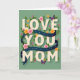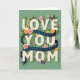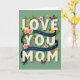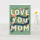 This design shows a sage green background with the words “LOVE YOU MOM” centered in large creamy white letters, shaded to look slightly raised and tender ❤️. The text sits in the middle while flowers and leaves curl over and around the letters, like a gentle hug framing the message. Pink roses and golden-yellow blooms mix with smaller blossoms and fresh green sprigs, creating a soft garden border that feels affectionate and close. A deep navy ribbon winds through the layout, looping between letters as if tying everything together like a thoughtful gift. Tiny white star shapes dot the ribbon, adding little glints that draw your eye across the words. Two purple-winged butterflies rest on the lettering, their patterned wings angled as if they’ve just landed near the greeting 🌼. The message is easy to read because the creamy white text contrasts against the muted green, with the flowers clustering more at the edges and corners. In the background, a few scattered minimalist shapes sit lightly behind the bouquet and ribbon.
