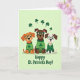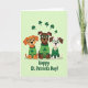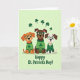 Designed with three cartoon dogs sitting in a gentle arc, this St. Patrick’s Day scene feels like a cozy group photo between close friends 💚. Each pup has rounded features and wide eyes behind green glasses, leaning slightly toward one another as if sharing a private joke. Their fur colors vary—one rust-toned, one deep chocolate, and one white with brown patches—adding contrast against the pale lime background. Two wear bright green sweaters with shamrock designs, while the third has a green striped top with a white clover detail and a small gold medallion. Dark green shamrocks drift above them like confetti, spaced across the upper area to frame their faces ☘️. Centered near the bottom, the text “Happy St. Patrick’s Day!” appears in dark green, standing out clearly beneath the trio. The background stays softly lit, with gentle shifts in green tones from the light wash behind them to the deeper greens in the clothing and floating shamrocks.