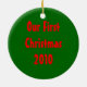 A ceramic fleur de lis Christmas ornament. On the front, a Christmasy green background, with red "writing", and a green fleur de lis design. The back is plain green, and we added the text "OUR FIRST CHRISTMAS 2010". You can keep that text or remove it, OR you can change it by typing in your own text! It's customizable that way. Makes a great holiday gift, or looks beautiful on your Christmas tree or Christmas packages.