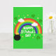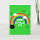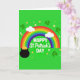 This card shows an emerald green background that sets a festive St. Patrick’s Day scene, with a wide rainbow arcing across the upper middle from red through violet, tucked between two fluffy white clouds 🌈. Just below the rainbow, the main text reads “HAPPY St Patrick’s DAY” in white, centered and easy to spot against the green. The word “HAPPY” sits above “St Patrick’s,” with “DAY” beneath, forming a stacked layout that feels balanced. In the lower left corner, a black cauldron overflows with neatly piled gold coins, like a shared treasure you’d point out to a friend with a grin 💚. Dark green four-leaf clovers are scattered around the background, adding little lucky accents that feel like they’re sprinkled across the space. Small star-like blossoms in pale orange and white dot the green area like confetti, filling the open areas without crowding the main elements. The rainbow’s curved banding, the soft cloud edges, and the coin stacks in the pot stand out clearly against the solid green field.