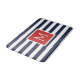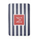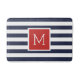 Custom monogrammed bath mat with a preppy stripe pattern in navy blue, red and white colors. Personalize it with your monogram initial in a square frame. Use the design tools to choose any background colors, edit the text fonts and colors and add your own photos to create a one of a kind design to match any bathroom decor.