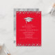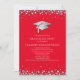This modern design features a graduation hat and confetti in silver on a background of red with white text.