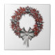 This festive ceramic tile design features a red and silver winter holiday wreath with holly berries and a silver ribbon bow. There are hints of white and black in the wreath.