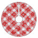 Tree skirt in a large, deep red and white buffalo plaid pattern, with a flurry white snowflakes