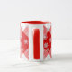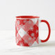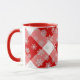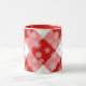 Mug in a large, deep red and white buffalo plaid pattern, with a flurry white snowflakes