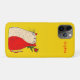 Charming illustration of a red and white cat sitting contentedly with a small flower on its back. The bright yellow background and simple lines create a cheerful, minimalist design that adds a fun and lighthearted touch to any iPhone case.