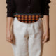 Stylish fanny pack with black trim for the on-the-go person and features the photo image of a red and white Collarette Dahlia bloom with yellow center on a black background and printed in a tiled pattern. A fun, floral design! Back of fanny pack is black.