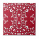 This ceramic tile features a rich, deep red background that serves as a striking contrast to the ornate white pattern adorning it. The central motif of the design is a symmetrical, elongated diamond shape, which could also be interpreted as a stylized representation of a flower or leaf. This central figure is surrounded by swirling vine-like patterns with leaf motifs, adding a sense of movement and sophistication to the overall design. The corners of the tile are not left bare but are adorned with additional decorative elements, contributing to the tile’s intricate aesthetic. The stark color contrast between the white pattern and the red background highlights each detail, making the complexity and craftsmanship of the design stand out.
