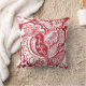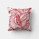 Throw pillow with a red and white garden design of birds, leaves, flowers, and butterflies. This drawing was inspired by the beautiful art of Chinese paper cutting.