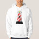 A really cool looking lighthouse design. This lighthouse is red and white striped and really makes for a great effect. This lighthouse has a black base, the red and white striped body and then the light at the top. This red and white lighthouse design looks great on this mens hoodie. Perfect for yourself or as a gift