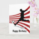 Modern soccer design featuring a silhouette of a soccer player kicking a soccer ball on a background of red and white arching lines. The perfect birthday card for the soccer player whose team wears red and white or a fan of a red and white team. The text, Happy Birthday, is fully customizable for your own message on the front. The inside of the card is blank for your own birthday message. pgb1501