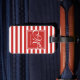 NewParkLane - Travel in style with this classic personalized luggage tag, with a red frame for your name and monogram, against a red and white striped background. Easy to customize in Zazzle with your own text for a personalized design. All text styles, colors & sizes can be modified to fit your needs.