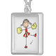 A cute stick figure cheerleading necklace featuring a girl cheerleader in a red and white uniform with yellow pom poms.