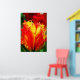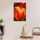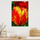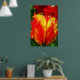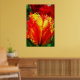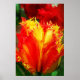 Poster colorful composition with curly tulip bright and shiny two colors. The image is a close capture, or macro shot, that exposes very clearly the petals sophisticated architecture with finely incised edges, thin texture lines and complicated red yellow intrications. The incised edges and vibrant color palette remind of a sparkling parrot, that's the origin of the other name of the flower, parrot tulip. Also known as "curly Sue" or fringed tulip, this lovely flower shows intense, flamboyant colors almost glowing under the mid day sunrays of May.