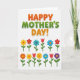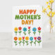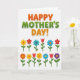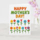 Designed with rounded, friendly lettering and a bright floral layout, this Mother’s Day card feels like a warm hug ❤️. The main text sits centered near the top, with “HAPPY” and “DAY!” in orange and “MOTHER’S” in green, each word edged in white with a soft shadow for lift. Beneath the message, two neat rows of stylized flowers line up like a cheerful bouquet offered with affection, their tidy spacing suggesting care and attention. The blossoms mix simple petal bursts and tulip-like shapes, with slender green stems and small leaves that lean gently as if reaching toward one another. Colors rotate through yellow, red, blue, orange, and purple, creating a friendly rhythm that reads like shared smiles across a table 🌼. The background stays white with faint light-gray diagonal stripes, keeping the foreground crisp and easy to see. The exclamation mark at the end of the headline is orange, outlined in white, and sits just above the top row of flowers.
