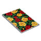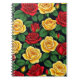 This spiral notebook features a vibrant pattern of red and yellow roses against a rich green background, set against a deep black backdrop. Ideal for daily notes, journaling, or as a thoughtful floral gift.