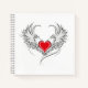 Artistically painted red heart with angel wings gray, decorated with black smooth contour.