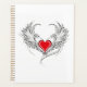Artistically painted red heart with angel wings gray, decorated with black smooth contour.