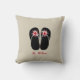 A pillow for teachers featuring an illustration of a pair of black flip flops decorated with red apples. Personalize with your name in red. Opposite side is red.