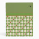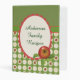This is a colorful family recipe binder! It features a large oval white banner trimmed with a red scallop frame, and a red apple with green leaves at the bottom. Your custom text is in dark green at the center of the banner. The image is placed on a bright red, green, gold, and white fruit pattern bottom background, which is separated from a solid green upper background by a green and white polka dot strip.