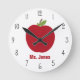 A clock for teachers featuring an illustration of a red apple. Personalize with your teacher's name in red.