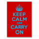A classic "Keep Calm and Carry On" style design with modern colors of red and aqua.