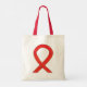 The tote bag features red awareness ribbon art. The red awareness ribbon color means support for AIDS / HIV, Cardiovascular (Heart) Disease, Stroke, Alcohol Substance & Drug Abuse, Blood Cancer, MADD (Mothers Against Drunk Driving), DARE (Drug Abuse Resistance Education), Hemophilia, Disaster Relief, Marfan Syndrome, Epidermolysis Bullosa (EB), Hypertension (High Blood Pressure), Love, and more. Let this Red Ribbon help bring awareness to these causes!