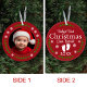 Introducing our exquisite custom photo ornament, a cherished keepsake for your baby’s first Christmas! On one side, capture the magic of the holiday season with your favorite photo, elegantly framed by delicate red snowflakes and lush green laurels on a red background. On the reverse side, commemorate this special moment with your child’s name and the year in white on a red background. This ornament beautifully blends the joy of the holidays with the timeless memory of your baby’s first Christmas. Make this holiday season truly unforgettable with a personalized touch! Photo and text can be edited from the product page. To change font styles or colors, use the design tool.