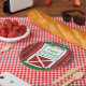 Red barn door custom party paper plates that can be personalized with your text or left with the Happy Holidays greeting sample text.