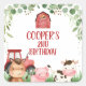 Sweet red farm themed birthday party favor sticker featuring a red barn and tractor as well as a donkey, pig, cow and mostly eucalyptus foliage arrangement. Great for a little boy's red farm themed birthday party.