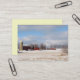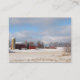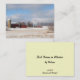 This artist trading card features a lovely rural winter scene. Red barns and a silo are surrounded by snowy white fields with just the stubble of mown hay showing through and a blue sky dotted with fluffy white clouds.