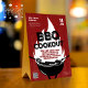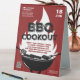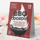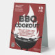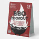 Advertise your BBQ Cookout event with this fun illustrative event table tent sign featuring a black grill with hot dogs and steak cooking, utensils, flame rising above grill, red rough texture background and typography. Customize to your liking.