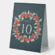 A dark green tented sign for christmas/holiday party table numbers, featuring hand painted red berries and eucalyptus arranged into a beautiful botanical wreath. All text is fully editable. Other designs, table number products and coordinating items are available in my store.