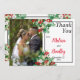 Vibrant colors of red holly berries and greenery with white roses garden floral swag wedding "Thank You" design originally illustrated and designed by Holiday Hearts Designs (rights reserved) exclusively for Zazzle with template photo credit to Daniel Suarez via Unsplash. Front features your photo on the left with two central floral swags overlapping a white panel with a rectangular black frame. Front message is "Thank You from" the bride and groom and your wedding date. The back features a corner floral bouquets in all four corners with a black rectangular frame beneath with your message, closing and typed signatures.