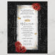You can fully personalize the elegant black calligraphy ("My Quinceañera") and modern typefaces to reflect your own party. Feel free to rearrange art elements to your liking. Should you edit the design further, you can uncover a warm tan vintage parchment paper texture should you prefer that over the white. These DIY invitations offer a one-of-a-kind, enchanting presentation perfect for marking a milestone in unforgettable style. Category: handmade scroll wedding invitations; scroll wedding invitations with butterflies; and RSVP DIY black white and red quinceanera scroll invitations. Black and red quince theme party colors: black, white, red and gold (with silver options).