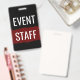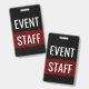 Classic event staff ID badges in a simple design printed on both sides in red black and white for corporate events, concerts, or seminars available in large quantities in bulk on a budget, or small quantities for smaller events.