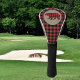 The background on this unique golf head cover is a red and black buffalo plaid pattern. At the center is a tan circle banner with a matching red and black plaid silhouette bear. Perfect for the golfer who is also a hunter, or just enjoys wildlife.