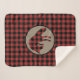 This attractive rustic sherpa blanket features a red and black buffalo plaid pattern. At the center is a tan circle banner with a matching red and black plaid silhouette jumping fox.