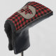 The background on this unique putter cover is a red and black buffalo plaid pattern. At the center is a tan circle banner with a matching red and black plaid silhouette moose head. Be sure to see the matching golf club head covers in our store.