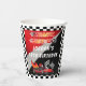 Race on over to celebrate a go kart racing-themed birthday. This birthday party design features a red and black go kart with a red helmeted drive and flames shooting out the back of the go kart. The words "Ready, Set, Go!" are also done in a flame-toned gradient. A pair of checkered flags are waving the driver off.