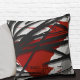 Modern throw pillow features a stylish artistic design in a red black and grey color palette. This artistic composition is constructed from an artistic woodblock design, layered over Memphis style design elements; layered design elements create highlights and shadows. The shades of grey with black accents complement the red background.