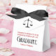 This modern custom law school graduation party favor box features the college graduate name in elegant red and black script for the class of 2024. Customize with your university under the scales of justice for a great graduation keepsake for a new lawyer or attorney.