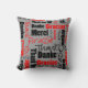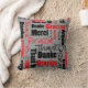 A sweet throw pillow design on front and back features a multilingual red and black "Thank You" word cloud in a variety of font styles over white. Click customize to select a background color other than white.